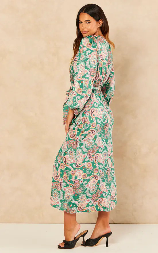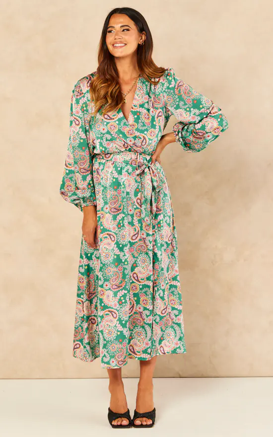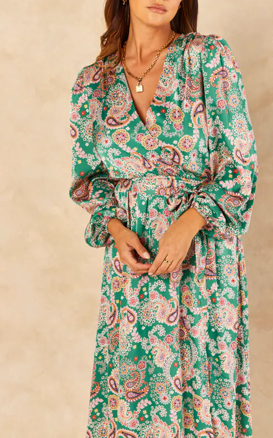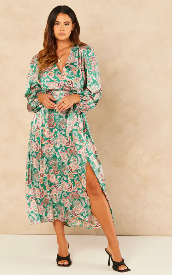These paisley printed dresses make you look feminine! This features a trendy wrap design with a belt, long sleeves and a slit in a silky and shiny satin fabric. You can wear it to any occasion, whether casual, brunch, work, or weddings!