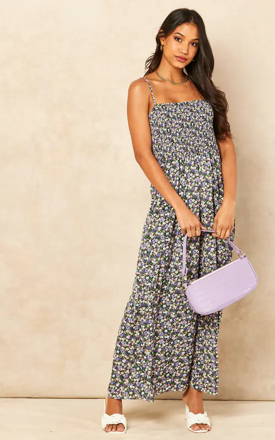 With a shirred square neckline and spaghetti straps, this Lilac Ditsy Shirred Strappy Midaxi Dress has a relaxed fit and a maxi length. Grab this adorable maxi dress and look adorable in purple ditsy floral!