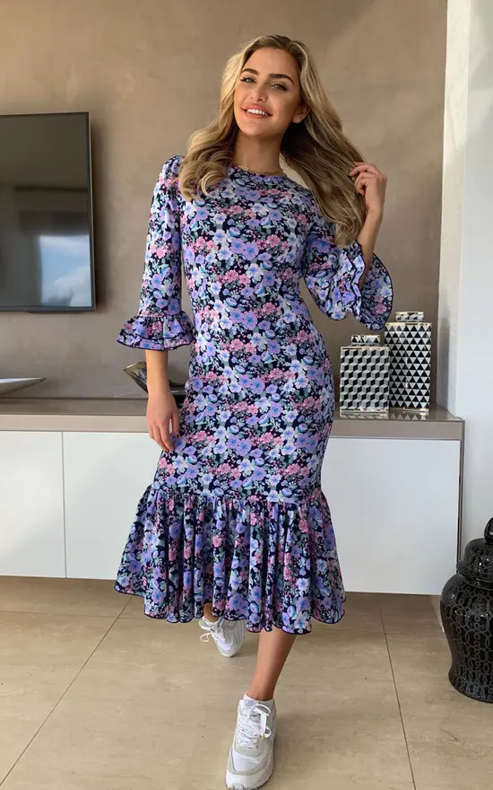 Add a pop of purple to your Spring wardrobe this year with our Arya dress. Featuring a pleated hem, frilled cuffs and a zip to the back. The figure skimming dress is perfectly paired with heels or trainers, depending on your vibe!