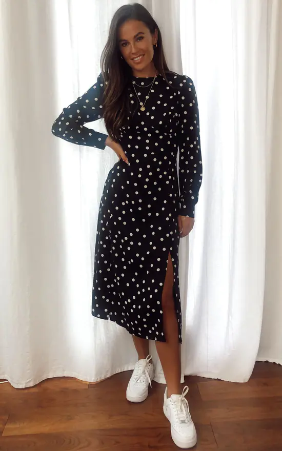 Add glam to your A/W collection with our Cass dress in polka print. Featuring a side split, cinched waist and long sleeves. Pair with boots or heels and a clutch.