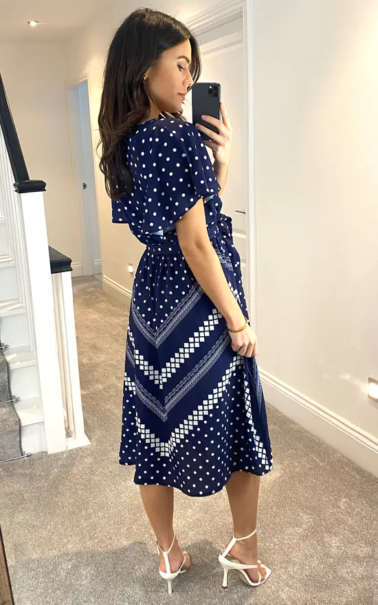 Spring is right around the corner, so why not start getting in the mood for the season. This fresh new design from Goddiva is definitely one of the top picks for this upcoming season. This wrap style flutter sleeve printed midi dress is the perfect choice for the seasons occasions, be it for wedding guests, brunches, dinners, date nights or any semi formal occasion, this midi dress is for you. With its classically faultless navy blue colour, this floaty summer dress is also a perfect pick for holidays. Its all over print brings a vibrant touch to this already elegant dress, not to mention its darling flutter sleeves which add a softer finish to this design. A wrap style dress is most likely the most flattering of styles for a woman as it helps to show off that incredible figure, with the belt on the waist giving you the opportunity to indulge showcasing your darling silhouette.