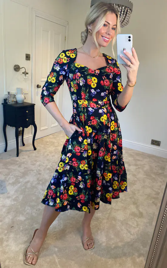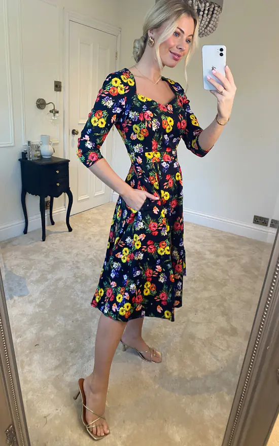 Our new Ashley Floral Swing Dress is a classic piece. Its bright florals pop against the dark black base, making it a magical winter print which stands out from the crowd. The sweetheart neckline works wonderfully with the shoulder panel to add that added design element that catches the eye and the waistband fits neatly above the full swing skirt. We have added our classic concealed side seam pockets to keep your treasures safe. Add your favourite jewellery to take this style from day to night!
