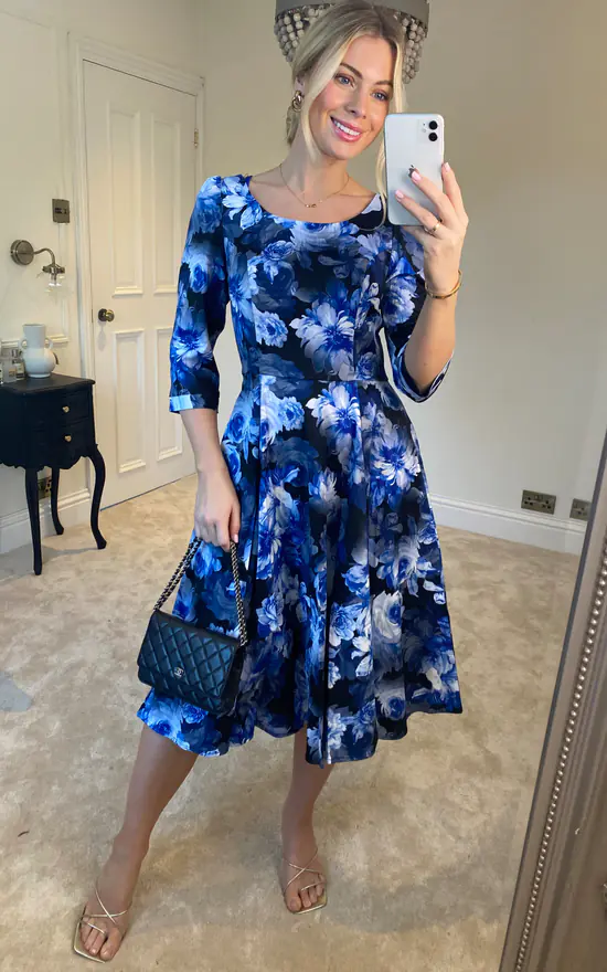 Beautiful in blue, this brand new Valentina Floral Swing Dress is effortlessly beautiful with its winter sky blue shades of large scale florals, scattered across the night sky black. The simple and elegant round neckline works wonderfully with this sophisticated style, sitting in harmony beside the gathered ¾ length sleeves. The swing skirt makes this piece great for dancing! While the hidden side seam pockets add ease to your day. Just pair this dress with your favourite flats or heels and you’re all set to go!