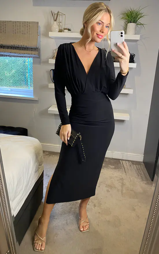 The Abbey Midi is the must have LBD of the season. This midi with long sleeves is perfect for the cold weather and is the perfect style to layer necklaces with as it has a plunge neckline (but is still bra friendly). It has some ruching on the side and a delicate side split.
