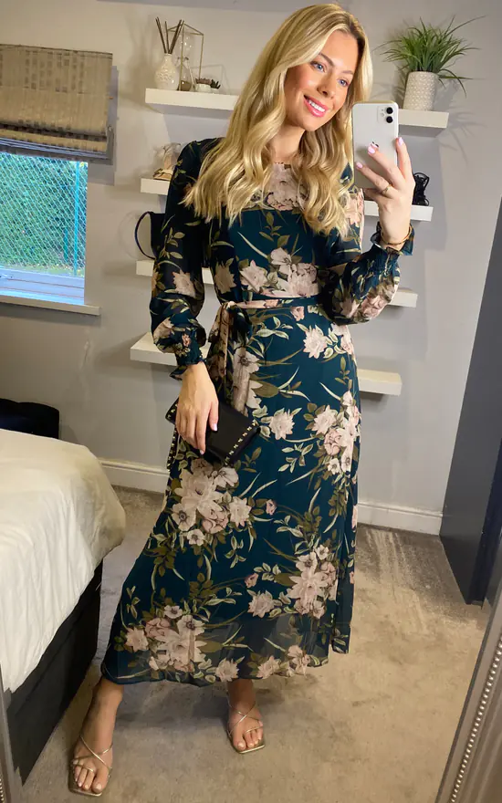No closet is complete without a bold floral print midi dress. With a round neck, long sleeves, a self-tie belt and a classic straight skirt sitting above the ankle. Style with blush heels for a daytime wedding.