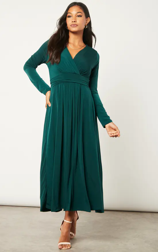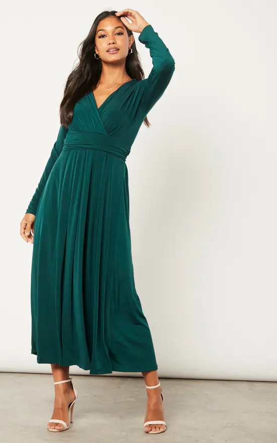 Long Sleeve Wrap Midi A-Shape dress in Dark Green Petrol. Has wrap detailing at the back.