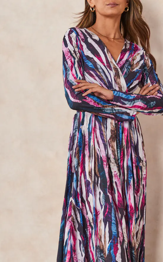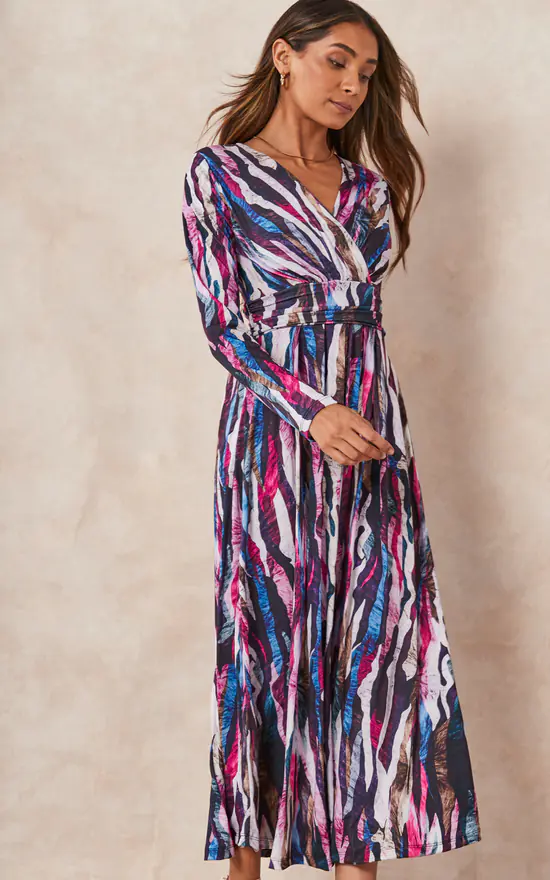 Long Sleeve Wrap Midi A-Shape dress in Purple Multicolour Abstract Animal print. Has wrap detailing at the back.