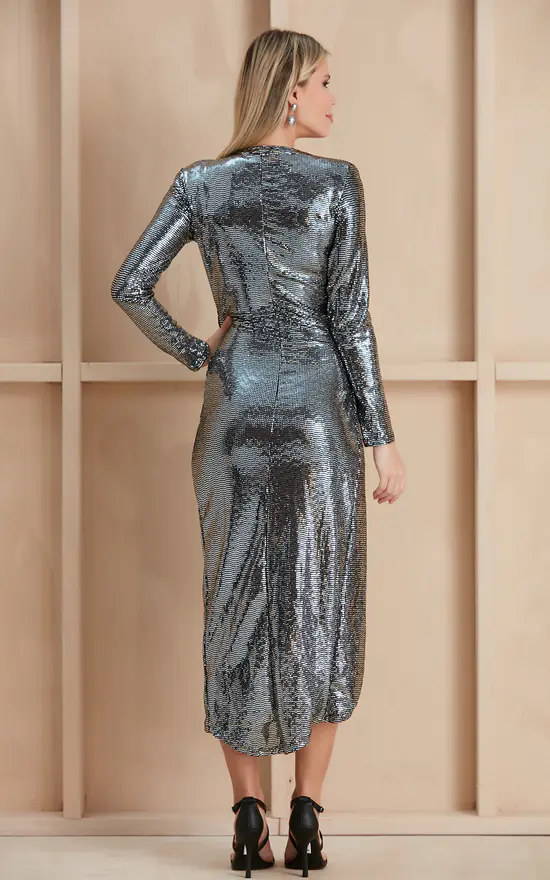 Long Sleeve Wrap Midi dress in Sequin Silver Colour. Made of Stretchy Sparkle fabric, that makes the fitting so comfy and relaxed.