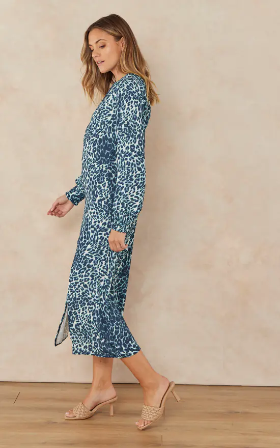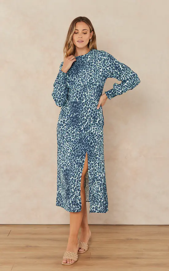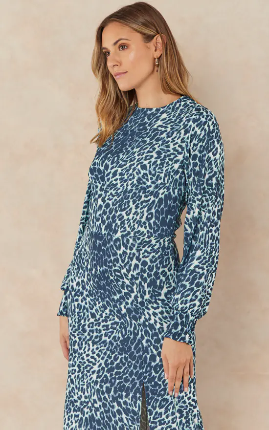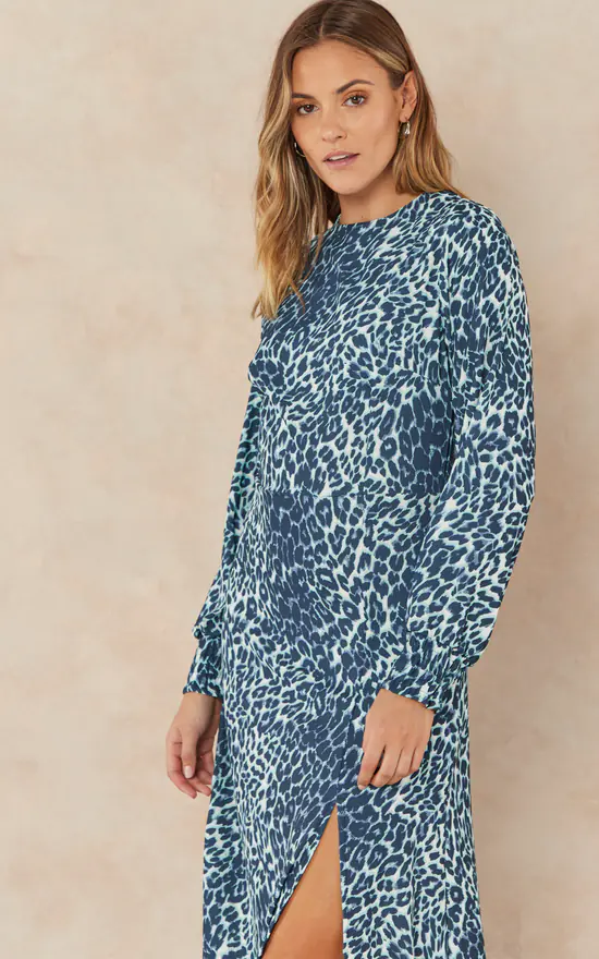 Long Sleeve Midi dress with Side slit in Gorgeous Blue Leopard animal print. Shift Midi dress with A shape skirt made of soft touch slightly stretching fabric, that makes the fitting so comfortable.