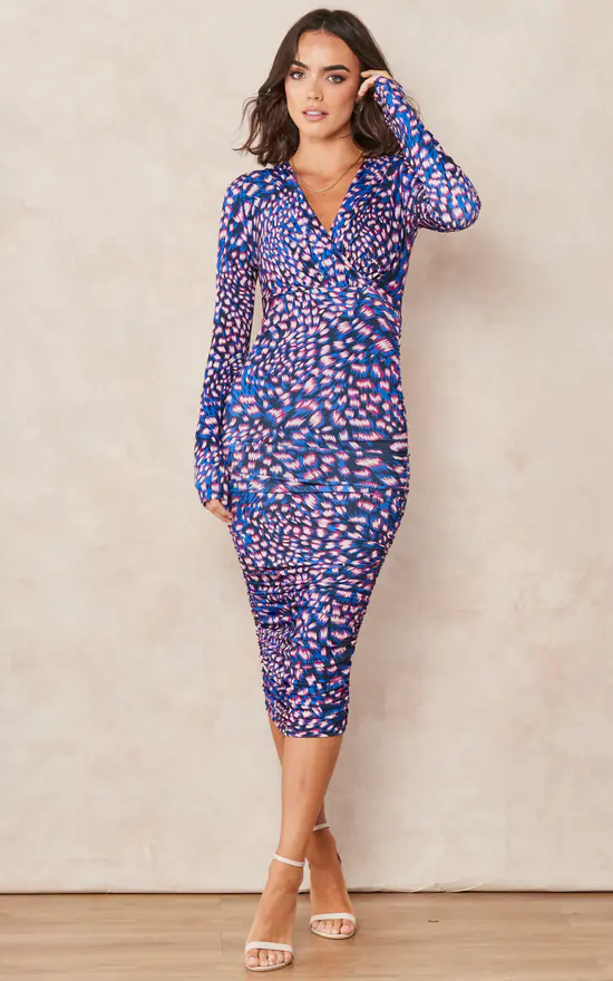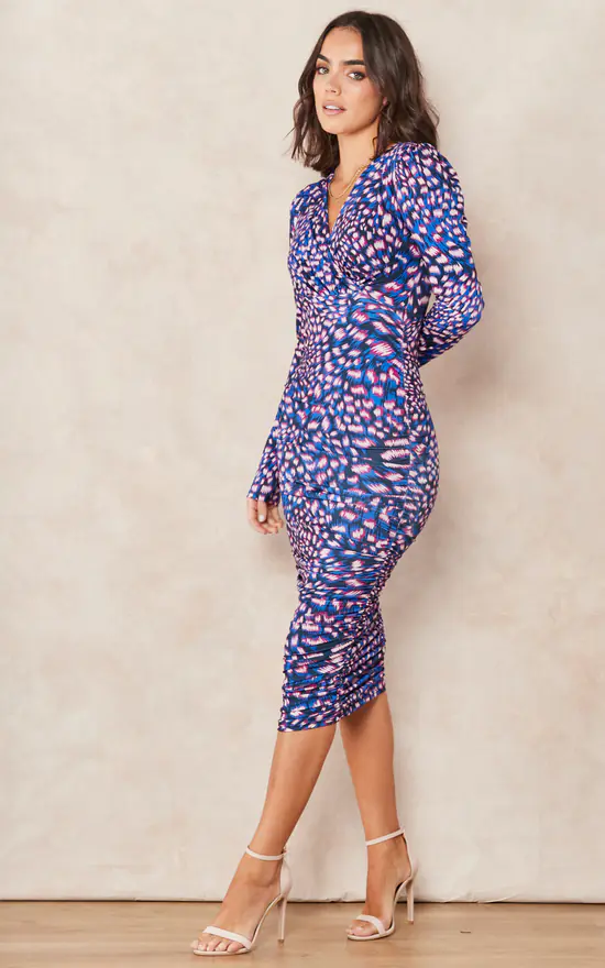 V neckline Long Sleeve Midi dress with drape detailing inSax Blue / Pink Abstract animal print.