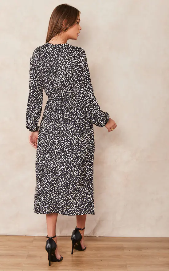 Long Sleeve Wrap Midi Dress with side slit in Black Abstract Polka Dot print. Asymmetric hem skirt and long sleeves fixed with lastic.