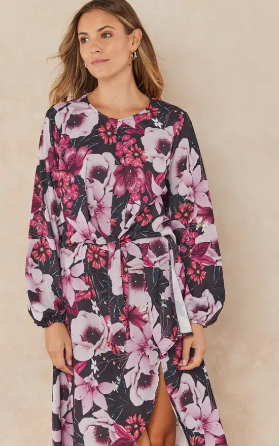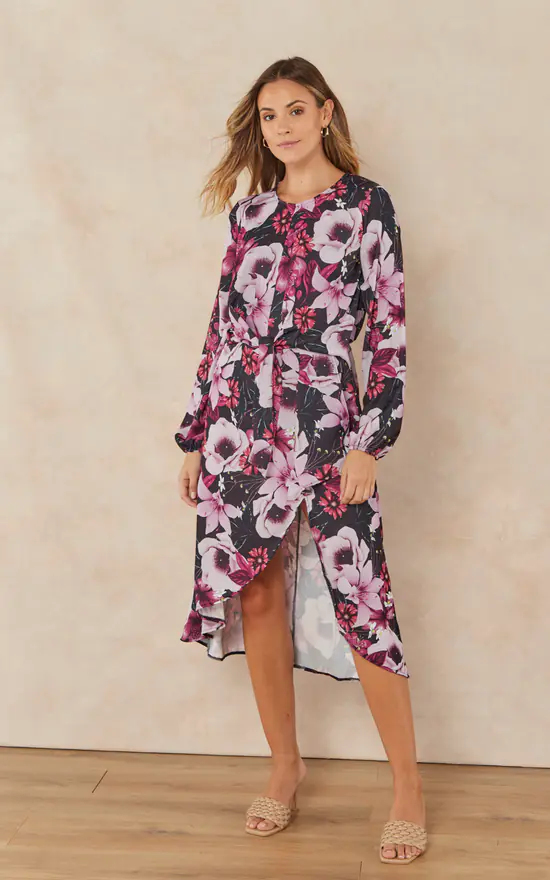 Long Sleeve Wrap Midi Dress with side slit in Pink Floral print. Asymmetric hem skirt and long sleeves fixed with lastic.