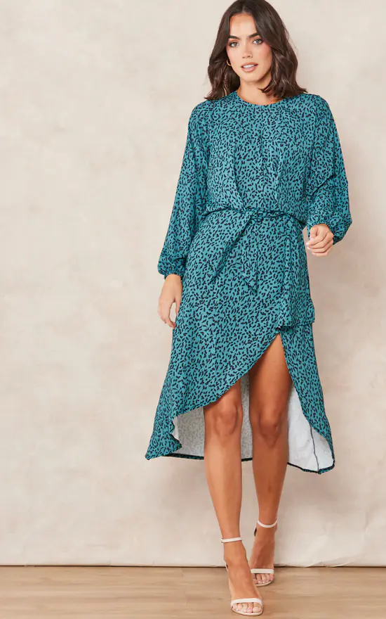 Long Sleeve Wrap Midi Dress with side slit in Green Abstract Polka Dot print. Asymmetric hem skirt and long sleeves fixed with lastic.