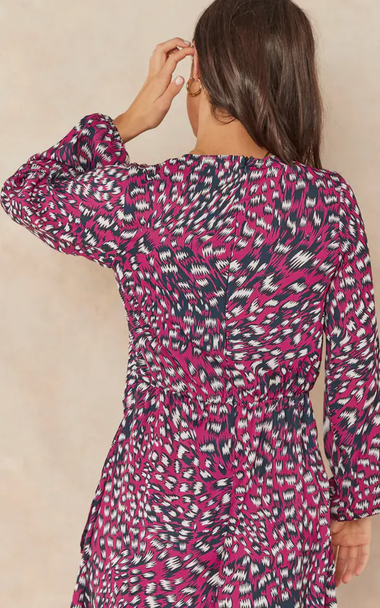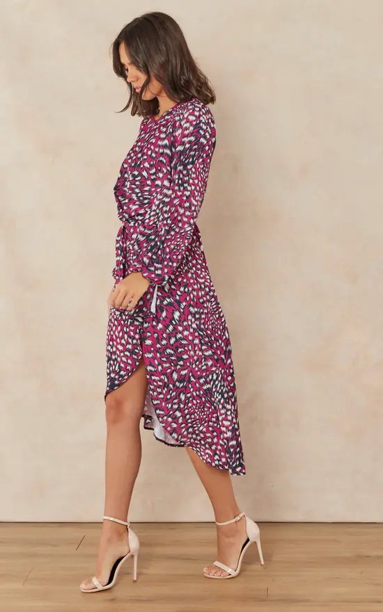 Long Sleeve Wrap Midi Dress with side slit in Hot Pink abstract Animal print. Asymmetric hem skirt and long sleeves fixed with lastic.