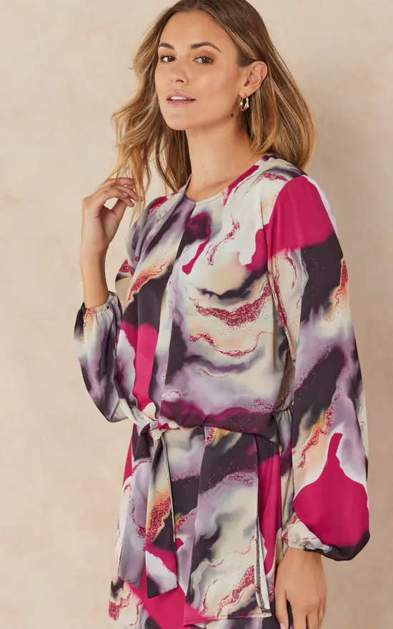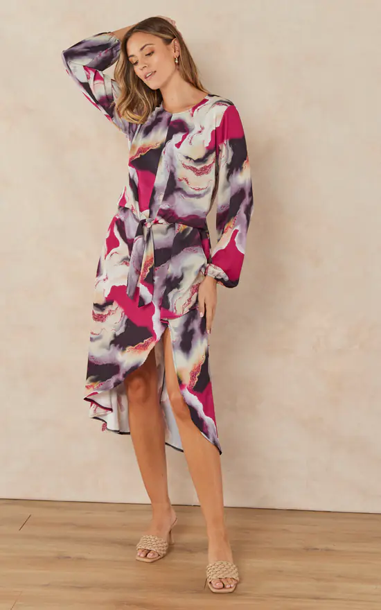Long Sleeve Wrap Midi Dress with side slit in Purple / Pink Abstract print. Asymmetric hem skirt and long sleeves fixed with lastic.