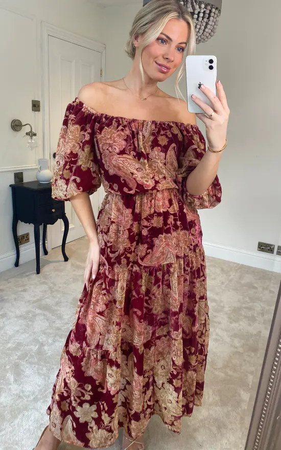 Bring a boho feel to your winter wardrobe with this rich devore dress. By combining a gorgeous print with overstated puff sleeves, we’ve created a piece with the dramatic flair we know you love. Finished with elasticated shoulders, waist and neckline that creates a stunning silhouette, this dress is especially designed to help you steal the spotlight.