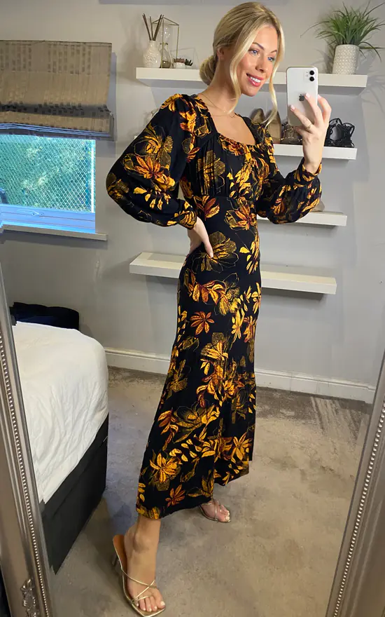 This glorious jersey dress is a real staple for the season. Not only does its pretty leaf print evoke the true feeling of winter, but its long, voluminous sleeves will help beat the chill too. We even give it pleats on the bodice to create an extra flattering fit. Try pairing this style with boots and a wide-brimmed hat, to add some chic, boho charm.