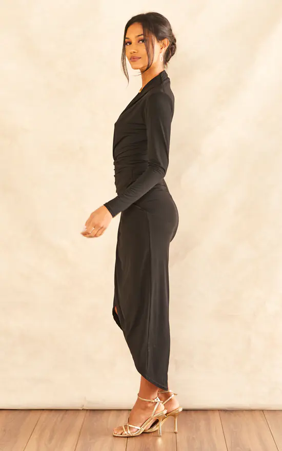 Make it a night to remember in this slinky black dress. Featuring a deep v neckline, wrap front skirt and sexy split leg, it’s the perfect dress for that special occasion.