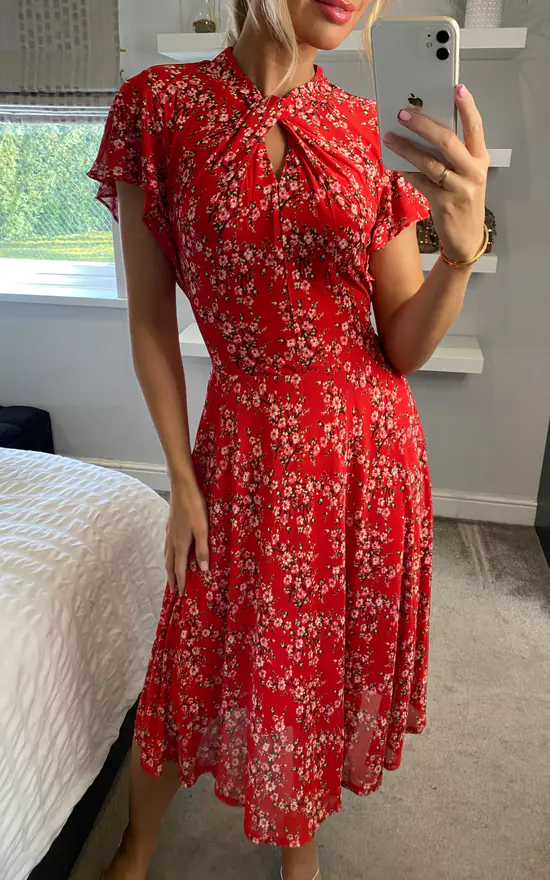 This midi dress by Jolie Moi is printed with pretty florals for added charm.