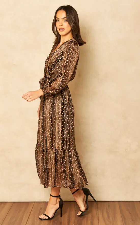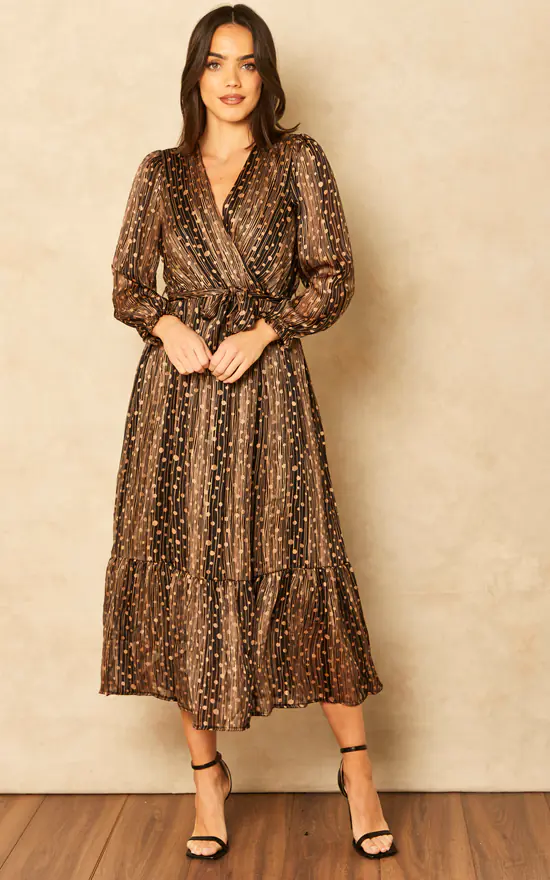 The gorgeous Modena dress gold, long sleeves with sheer effect V neckline, faux wrap top and elasticated waist with tie wrap belt Lining. Pair it with tights and heels or boots for a chic and dressy outfit.