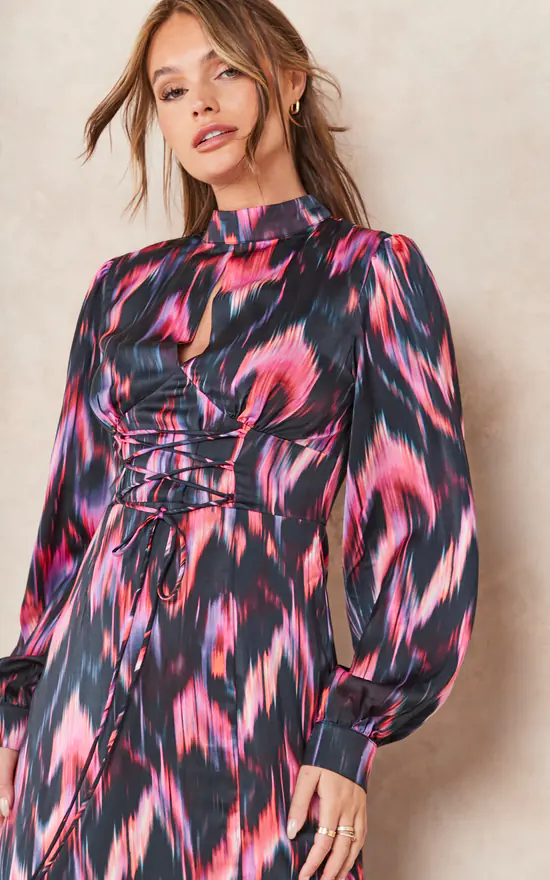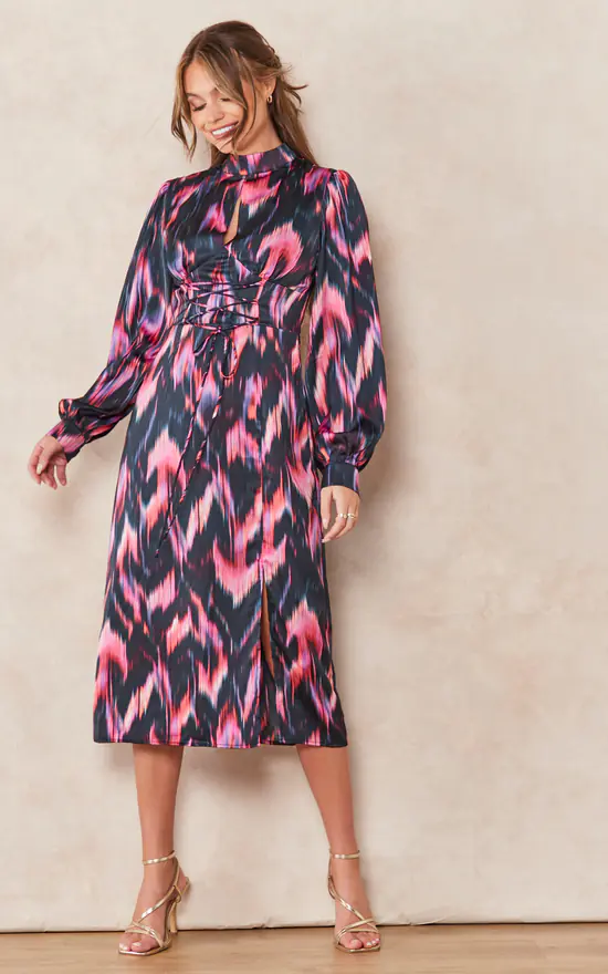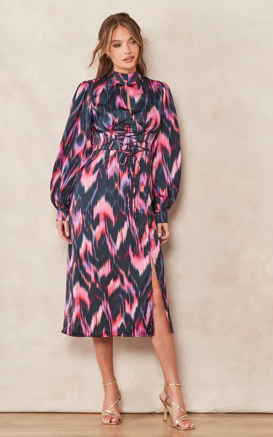 The perfect dress for this Autumn/Winter. Featuring a midi length skirt and long balloon sleeves it is the perfect piece to wear under an elegant coat. Pair with a pair of knee-high boots and a long length coat for an impactful look. Featuring a lace up detail on the waistline it can be adjusted to accentuate any figure in the most flattering way. The abstract feather print has accents of warm vibrant colours which pop against a dark black backdrop.