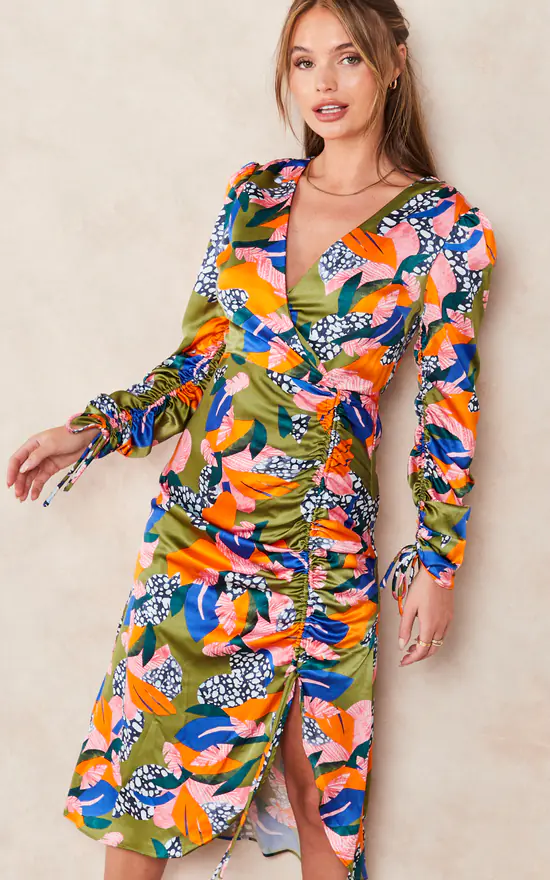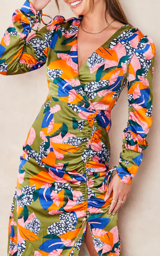 This is the perfect statement piece to spice up your closet this Autumn. With adjustable long sleeves and a ruched midi length skirt it can be altered to suit any occasion and weather situation. Pair with thigh high boots and a long coat for a stylish yet cosy look on cooler days or with heels and a colourful clutch bag for warmer evenings. The abstract leaf print includes a variety of collage like leaves with different textures in a mixture of warm and cool tones against a moss green background.