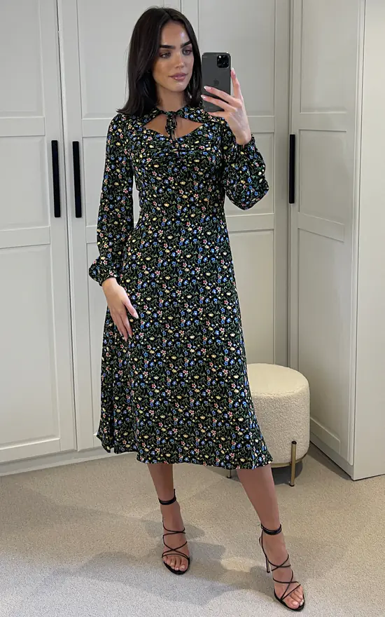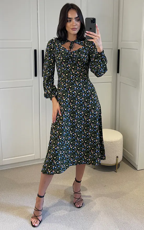 Dress up in a cute floral print courtesy of the lovely Liquorish, featuring a peekaboo neck with tie detail & long sleeves.
