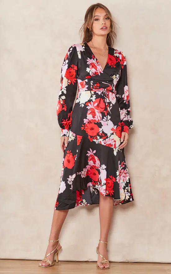The perfect dress to add some warmth to your wardrobe this Autumn/Winter, with tones of rosy reds and pinks. The style includes long balloon sleeves and a midi length skirt making it the perfect piece to pair with knee high boots and an elegant coat for an impactful look or heels and statement earrings for a glamour look. Featuring lace up detail on the waistline it can be adjusted to accentuate any figure in the most flattering way. The rose print features paint like textured roses in hues or vibrant pinks and reds against a contrasting black background.