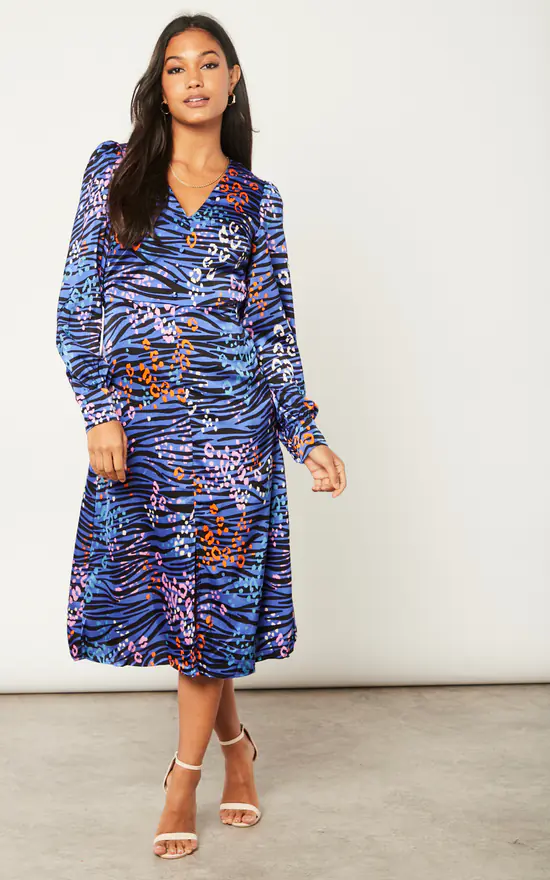 The perfect bold statement dress to brighten up your Autumn/Winter. With details such as a button up neckline, bold print and balloon sleeves, it is one of a kind. Pair with knee high boots and a long length brightly coloured coat for a impactful look. The vivid zebra print features an electric blue zebra print background with abstract orange and pink leopard print marks weaving in and out of the zebra stripes.