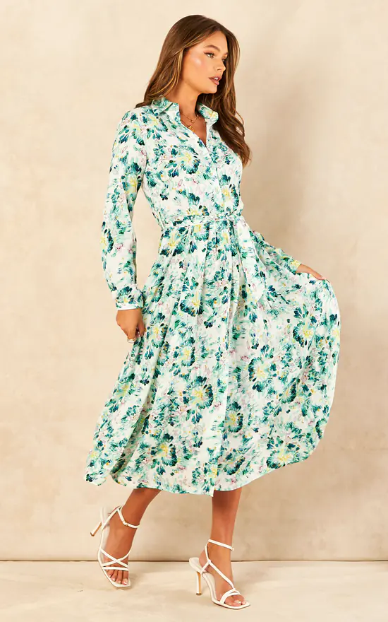 This dress is made from soft fabric printed with green florals on white colour base, it has buttons through the front and slightly flared hem.