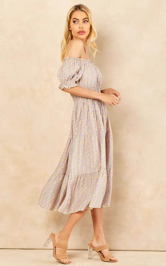 This gorgeous purple floral dress is a must have for Spring/Summer. With ruffled sleeves and an off the shoulder design for a cute warm weather look. Shirred elasticated waist gives this dress a slim silhouette with a comfortable fit.