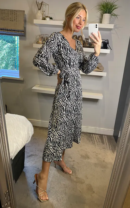 The Mela Black Zebra Print Midi Dress is the perfect addition to your wardrobe this season. In an easy skater shape, the long balloon sleeves and self tie waist elevate this piece. The V-neckline and lightweight fabric make this the perfect work to weekend attire.