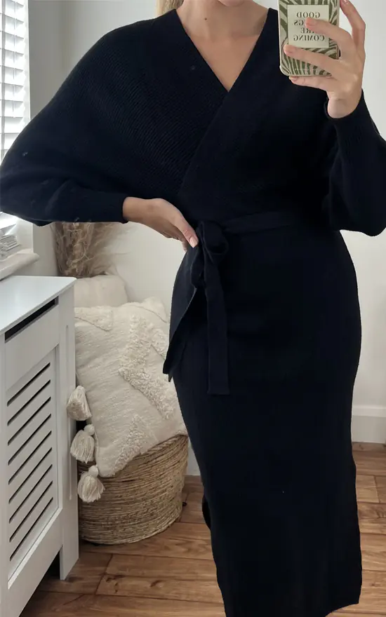 Beautiful long lantern sleeve belted split midi jumper dress in black, perfect day dress for work, office, or night out, just casual drinks with friends. From work to play.