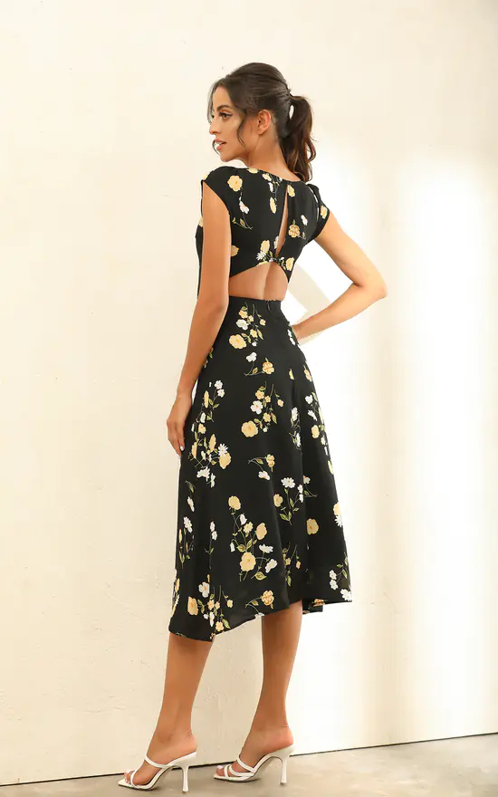 Beautiful floral print cap sleeve v neck split midi dress in black, perfect day dress for summer, holidays or just casual drinks with friends