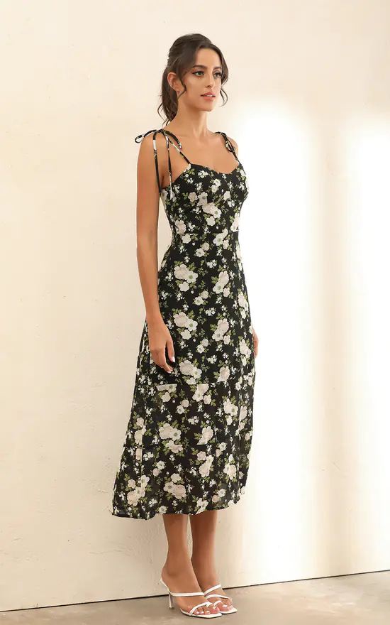Beautiful floral print sleeveless spaghetti strap midi dress in black, perfect day dress for summer, holidays or just casual weekend with friends
