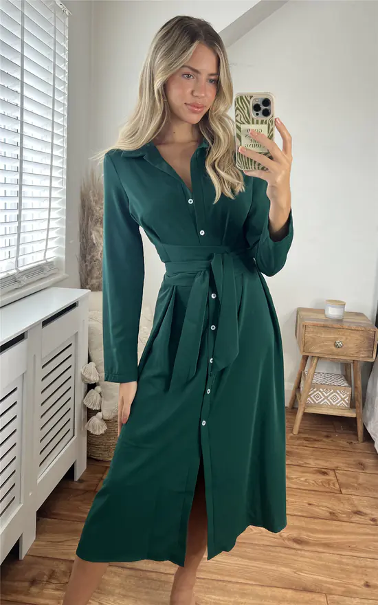 Beautiful long sleeve midi shirt dress in green, Perfect for winter, party, office or casual drinks with friends