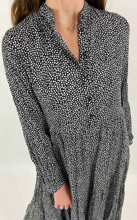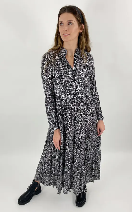 Our Lula dress is the perfect easy summer dress for every occasion this season! This style is ideal with sandals or trainers and can be dressed up or dressed down whatever the occasion. This style features a front button down placket, a mandarin collar, tier detailing on the skirt, full length sleeves, is midi in length and is a smock shape. This style comes in a black base print with white ditsy print detail.