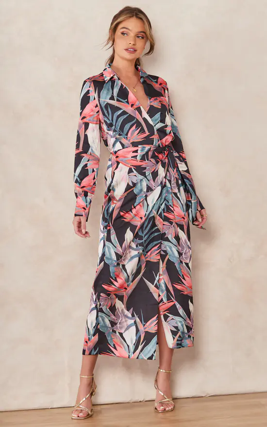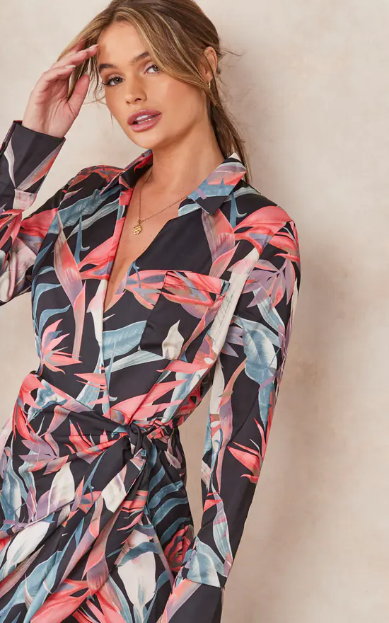 The relaxed wrap shirt dress will make you stand out in this tropical, floral black print.