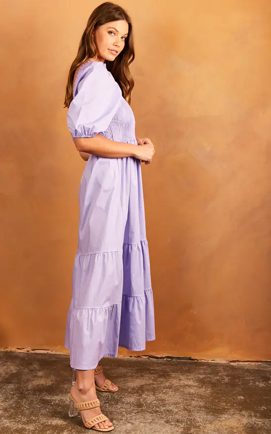 Lilac Bella floaty midi dress with Balloon Sleeves. Fresh and breezy the Bella dress is the most romantic dress around. Featuring shirred details and hugging neckline, this maxi can be worn off the shoulder or with the cute balloon sleeves up. Team with sneakers, sandals or heels.
