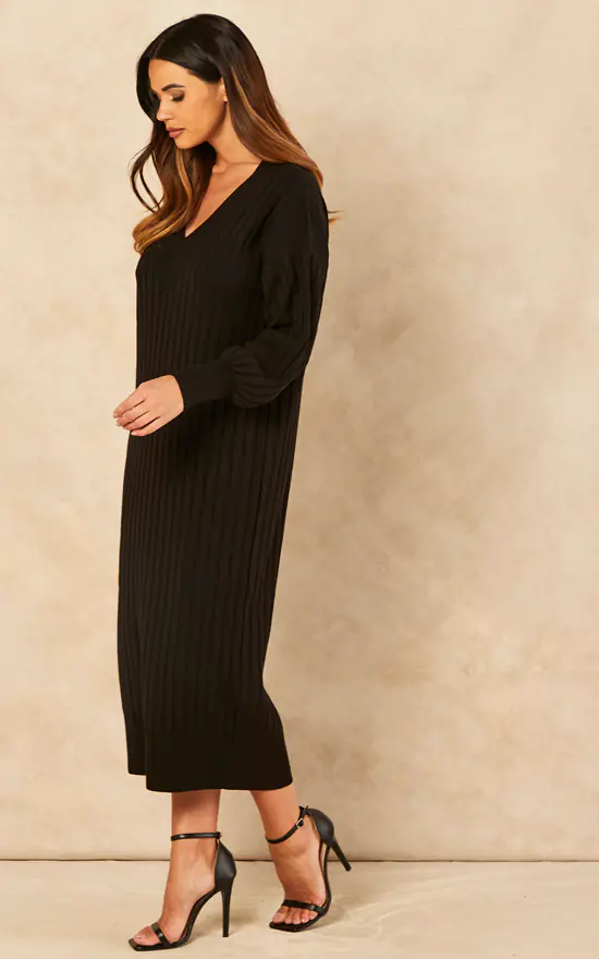 This knitted midi length ribbed dress with long sleeves and v-neck is an addition your wardrobe needs. Wear during the day with flats and change to heels for an effortless day-to-night look.