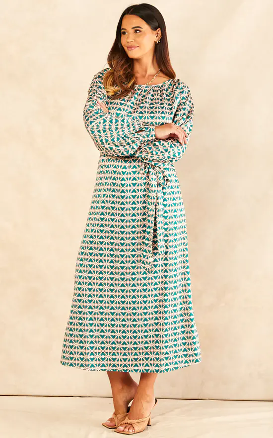 The Addison Dress is a sophisticated midi dress with a stunning green geometric print. The round neckline features soft pleating details, long sleeves and a detachable tie up belt for easy fit. This is a great dress for Autumn and Winter events that is comfortable for everyday and can be dress up for formal events with a heel.