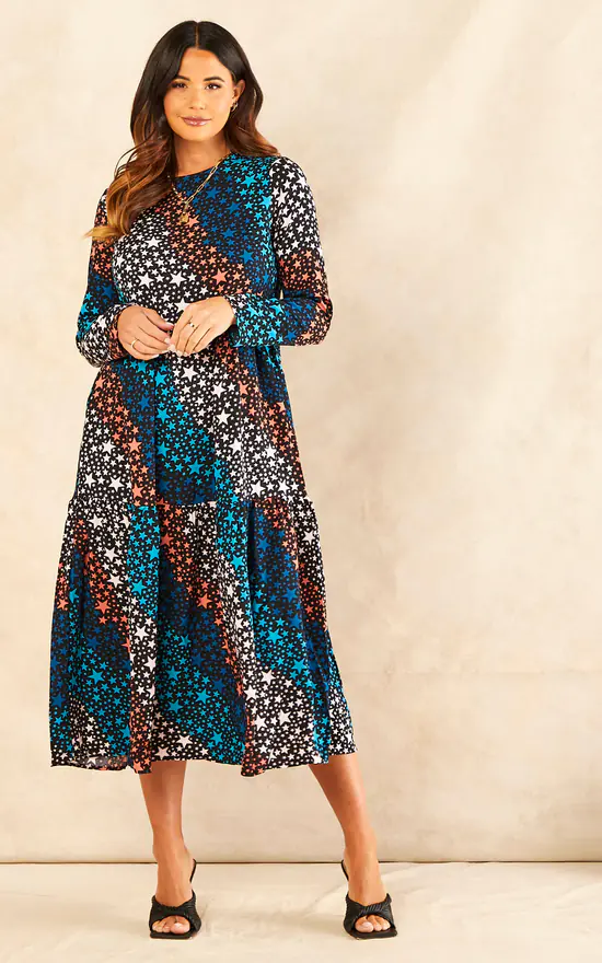 Sparkle and shine in this stunning Tierd Star Print Dress. Our unique star wave print design on this fabulous long sleeved dress will have you turning heads for all the right reasons. A must have addition to you your party season wardrobe, this dress can be worn for formal events or casual yet dressy evening out. Pair with one of our luxurious genuine Italian leather handbags to complete your outfit.