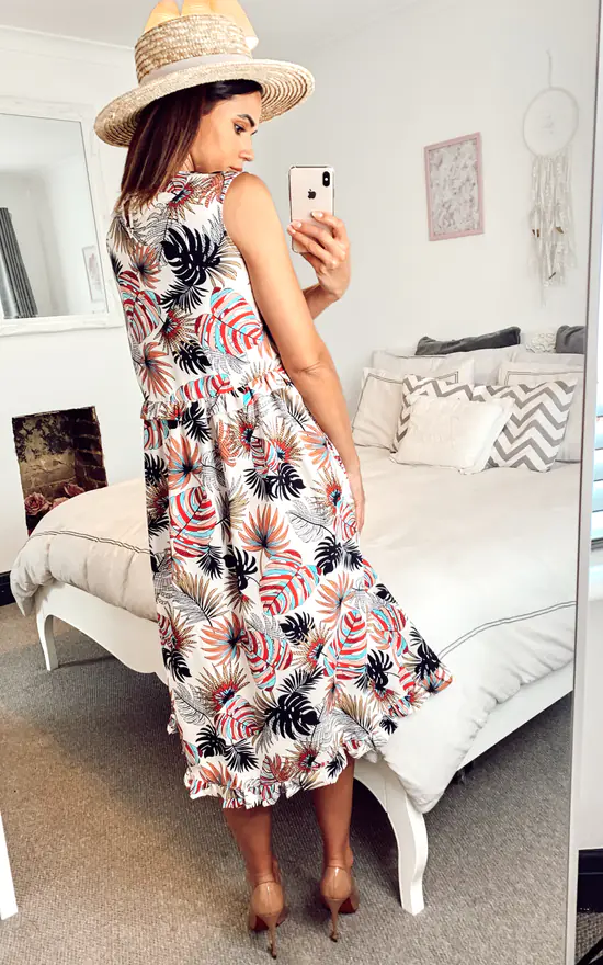 Classic romance is capture through a modern lens with this tropical summer style. You’ll be sure to turn heads with this piece! All-over leaf design. Midi length. Polyester fabric. Cotton blend. Round neck. Sleeveless. Frill design waist and bottom hem. Button keyhole back neck. Perfect for sitting outdoors at your local cafe or family lunch or casual weekend. Wear with heels and statement jewellery. Relaxed fit.