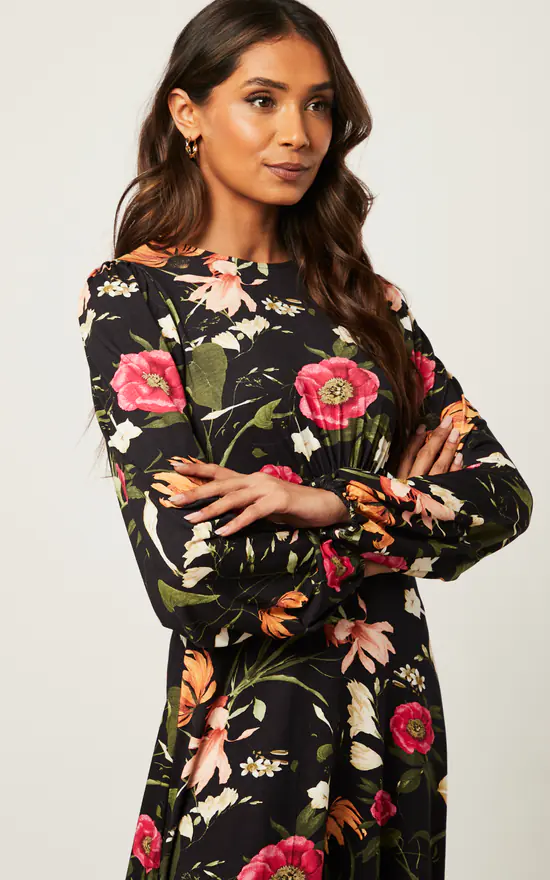 Embrace yourself with this Red floral dress with dark base from our Trendy collection. Complete with a bold floral print that’s sure to make you stand out.