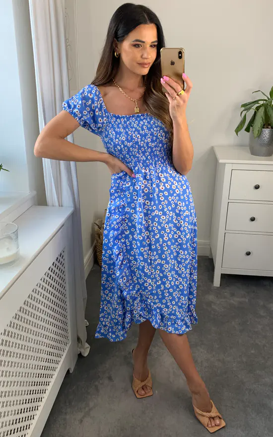 Made with elasticated detailing on the top, this midi dress has a frill detailing along the skirt to the hem.