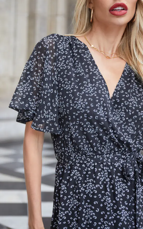 This ruffle sleeve patterned midi dress is suitable for all seasons.