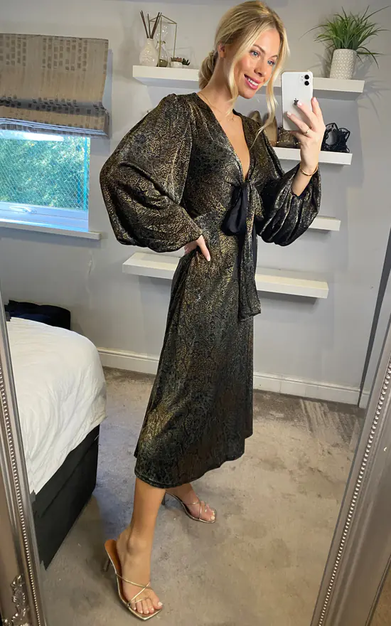 Dare to Bare in this beautiful Faltering Dress. A stunning metallic fabric adds glamour to this midi dress with its tie front, billow sleeves and low neckline. 60% nylon, 35% metallic and 5% elastane. Hand wash only.