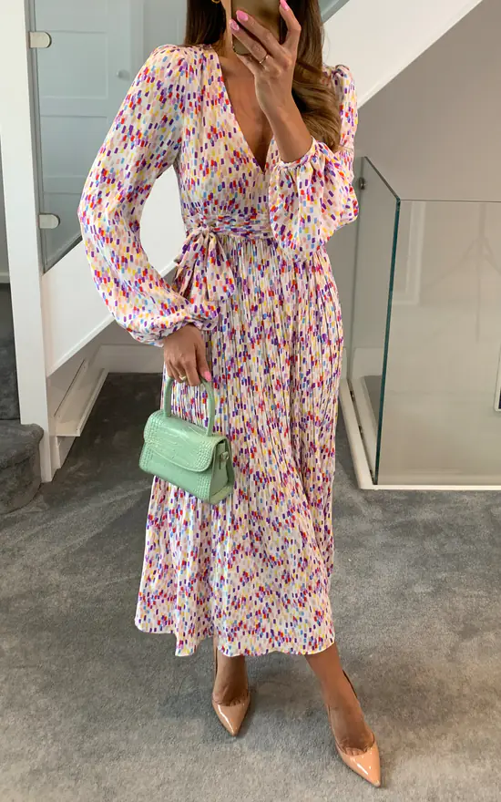 Harness laid back femininity in the abstract Fathomless Dress. An effortless long-sleeved silhouette that falls from the V-neck bust to a pleated calf grazing hem. Side zip and belt. 100% polyester