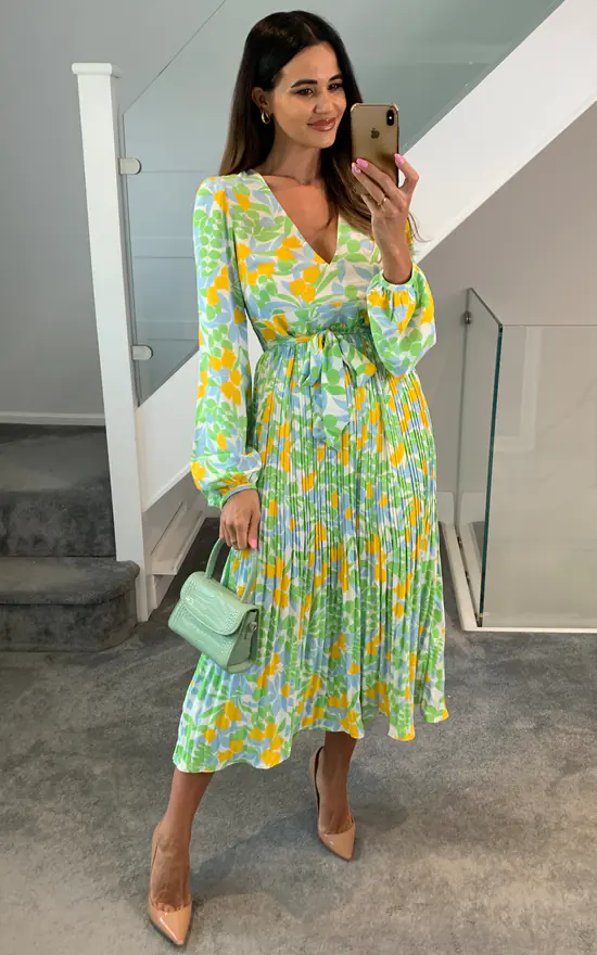 Harness laid back femininity in the Feels Like Summer Fathomless Dress. An effortless long-sleeved silhouette that falls from the V-neck bust to a pleated calf grazing hem. Side zip and belt. 100% polyester.