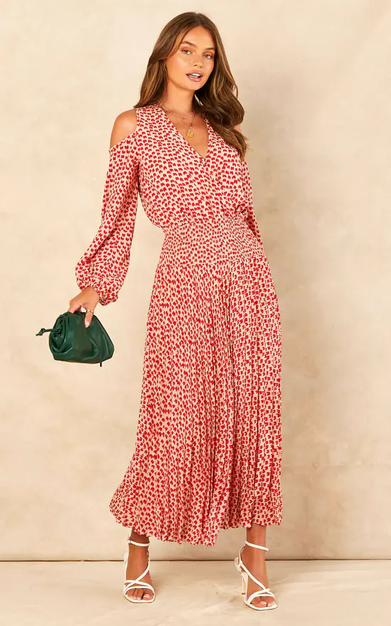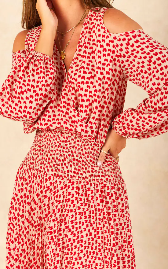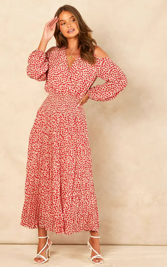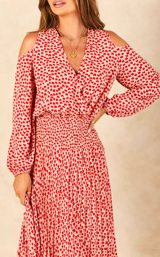 Our Trials and True Romance Requiem Dress couples a playful pattern with a soft tailored silhouette. Its sumptuous silhouette is elegantly tailored to feature cold shoulder, v-neckline and a gently flared midi hem.